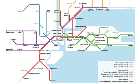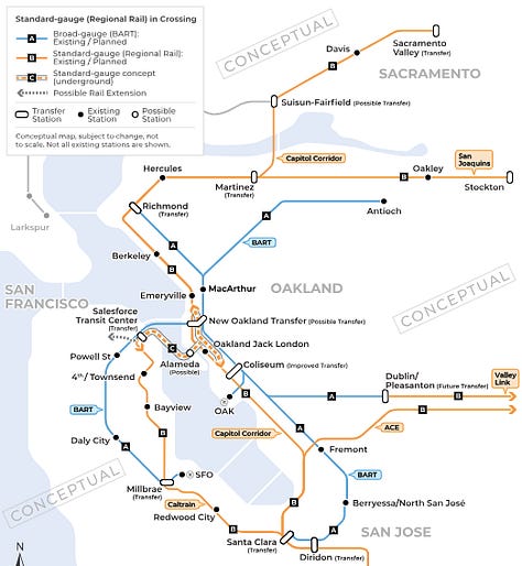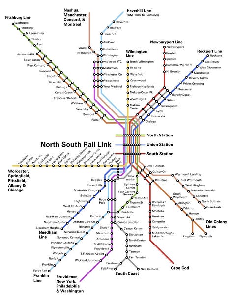 Look at the existing terminus stations in downtown Boston and downtown San Francisco. Imagine new tunnels going across downtown (in Boston’s case) or the Bay (in San Francisco’s) uniting the disconnected halves of the commuter rail system into an interconnected regional network.