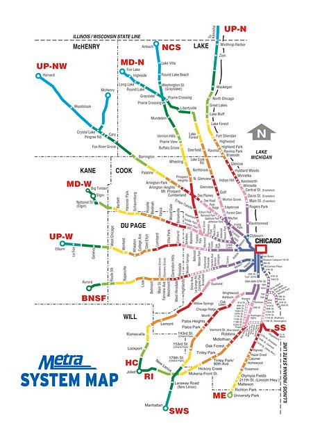Look at a map of Metra in Chicago, Metrolink in Los Angeles, SEPTA in Philadelphia, or Tri-Rail in Miami. Now imagine each of those lines are lines on a subway map, where the expectation is that trains will arrive every ten minutes or better throughout the day.